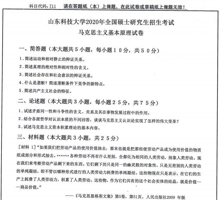 以上就是小編整理的“考研真題:山東科技大學711馬克思主義基本原理2020年碩士研究生自命題試題”的全部內容!更多真題資料請關注“考研專業課真題”欄目!祝考研成功!