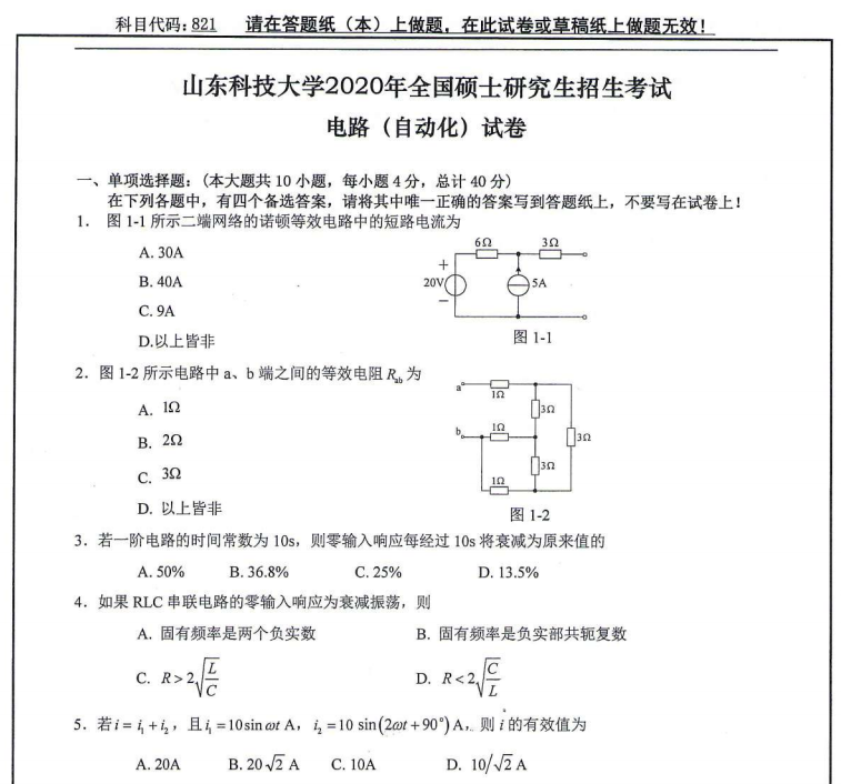 以上就是小編整理的“考研真題:山東科技大學821電路(自動化)2020年碩士研究生自命題試題”的全部內容!更多真題資料請關注“考研專業課真題”欄目!祝考研成功!