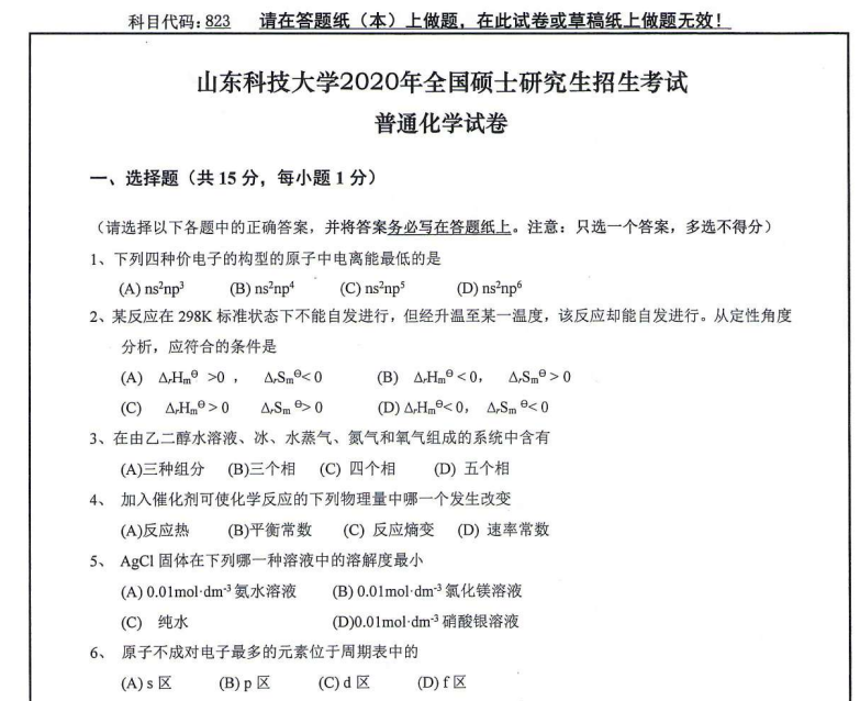 以上就是小編整理的“考研真題:山東科技大學823普通化學2020年碩士研究生自命題試題”的全部內容!更多真題資料請關注“考研專業課真題”欄目!祝考研成功!