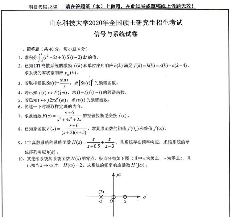 以上就是小編整理的“考研真題:山東科技大學830信號與系統2020年碩士研究生自命題試題”的全部內容!更多真題資料請關注“考研專業課真題”欄目!祝考研成功!