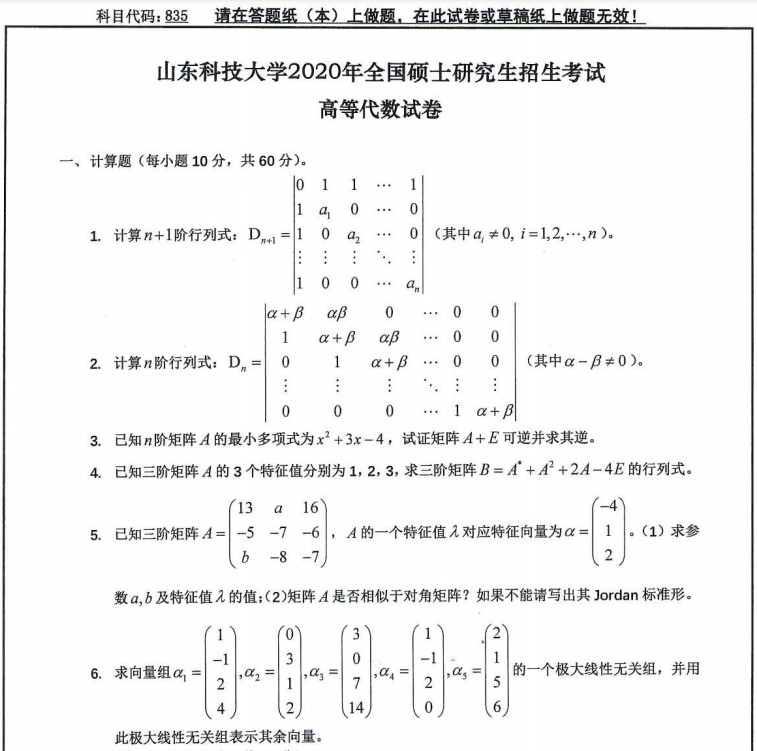 以上就是小編整理的“考研真題:山東科技大學835高等代數2020年碩士研究生自命題試題”的全部內容!更多真題資料請關注“考研專業課真題”欄目!祝考研成功!