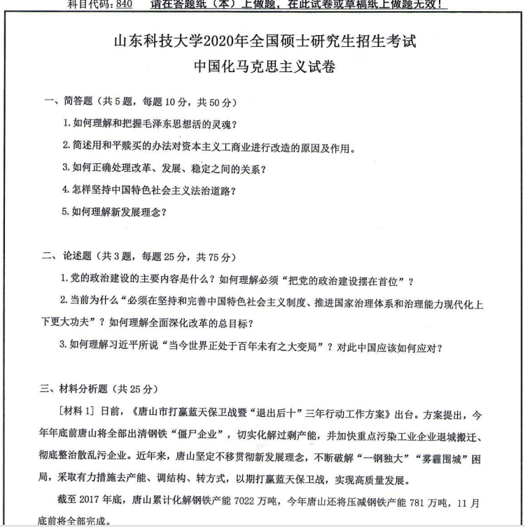 以上就是小編整理的“考研真題:山東科技大學840中國化馬克思主義2020年碩士研究生自命題試題”的全部內容!更多真題資料請關注“考研專業課真題”欄目!祝考研成功!