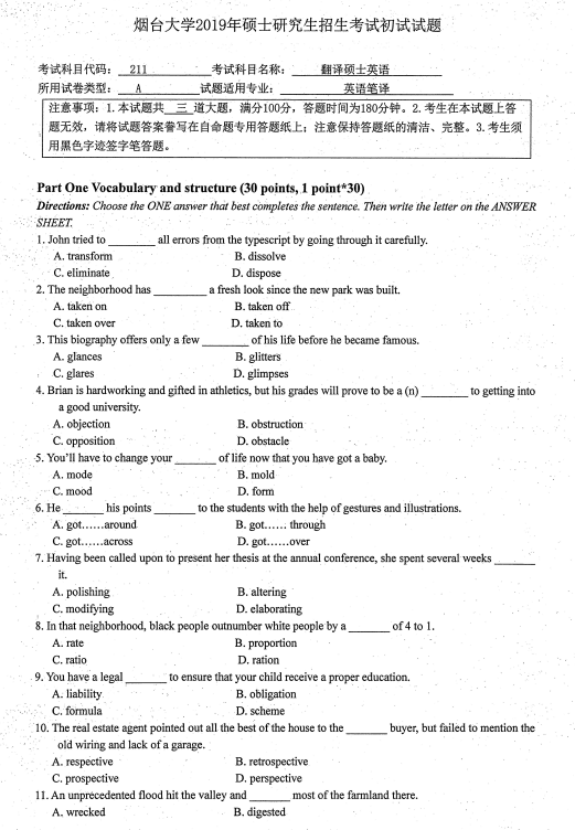 以上就是小編分享“考研真題:2019年煙臺大學外國語學院碩士研究生招生考試初試自命題-211翻譯碩士英語”的全部內容內容,想了解更多考研相關信息,請持續關注研線網。