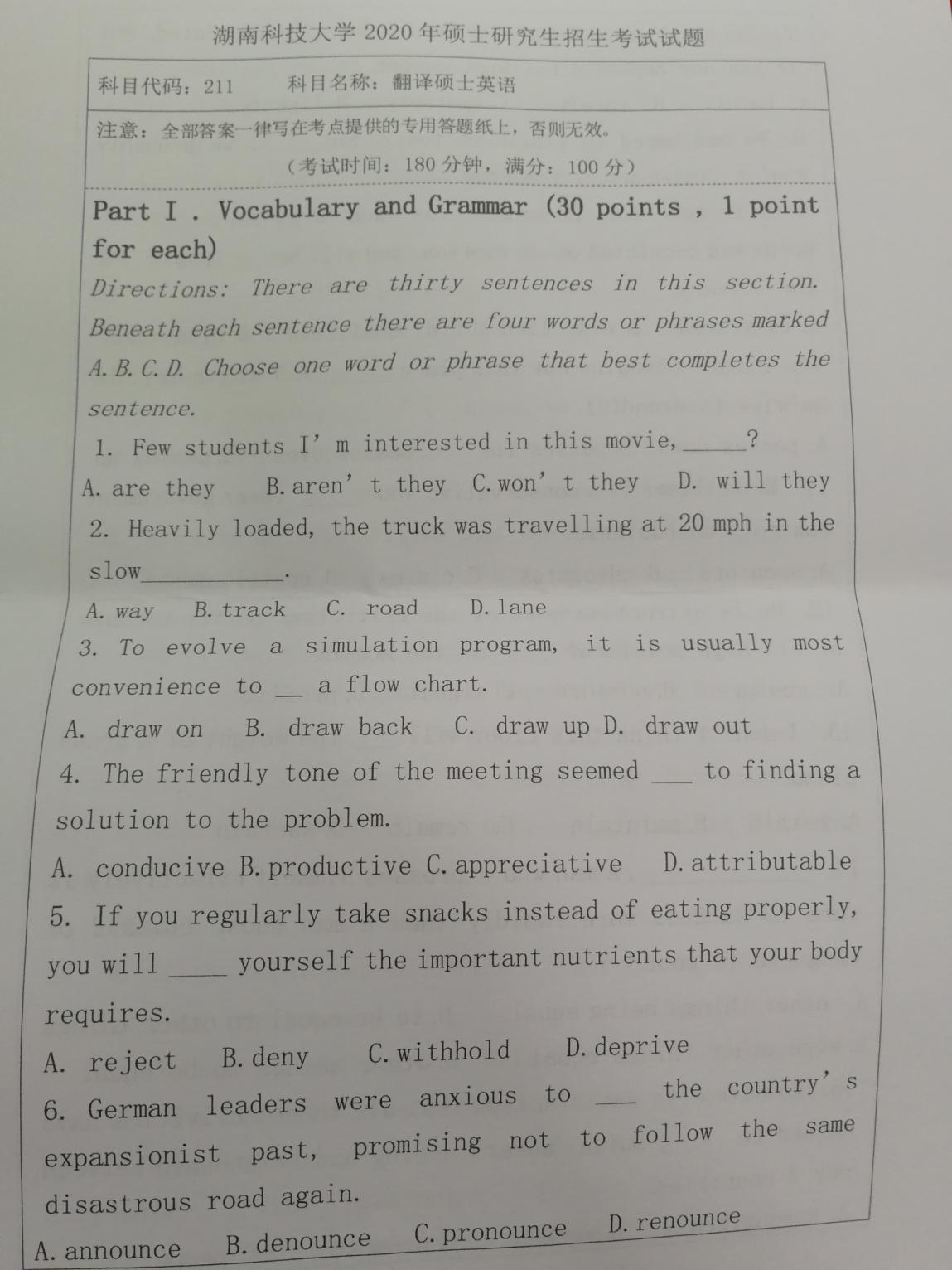 以上就是小編整理的“考研真題:湖南科技大學211-翻譯碩士英語2020碩士招生考試自命題科目試題”的全部內容!更多真題資料請關注“考研專業課真題”欄目!祝考研成功!
