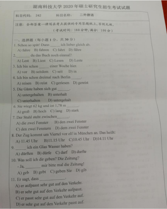 以上就是小編整理的“考研真題:湖南科技大學242-二外德語2020碩士招生考試自命題科目試題”的全部內容!更多真題資料請關注“考研專業課真題”欄目!祝考研成功!
