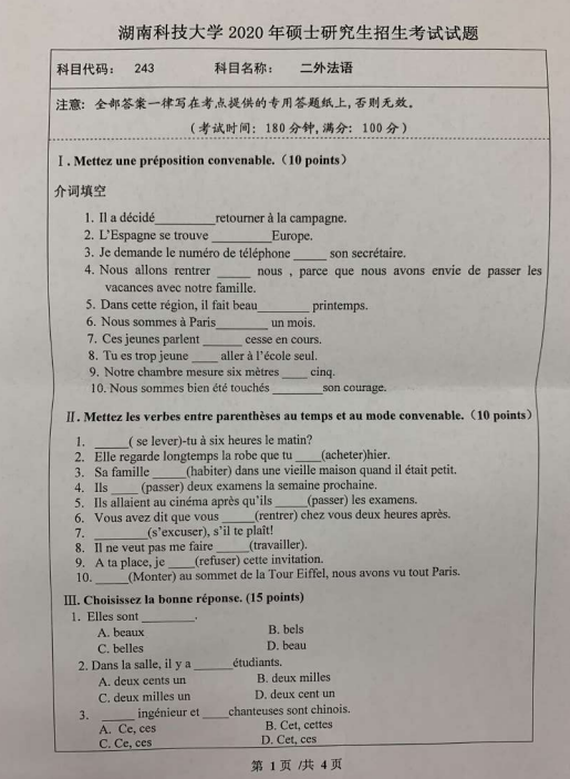 以上就是小編整理的“考研真題:湖南科技大學243-二外法語2020碩士招生考試自命題科目試題”的全部內容!更多真題資料請關注“考研專業課真題”欄目!祝考研成功!