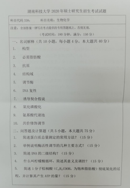 考研真題:湖南科技大學(xué)338-生物化學(xué)2020碩士招生考試自命題科目試題