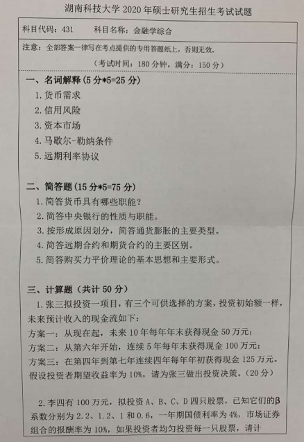 以上就是小編整理的“考研真題:湖南科技大學431-金融學綜合2020碩士招生考試自命題科目試題”的全部內容!更多真題資料請關注“考研專業課真題”欄目!??佳谐晒?!