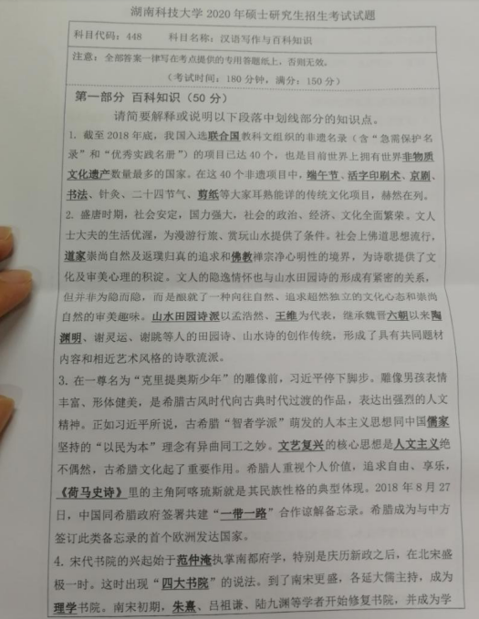 考研真題:湖南科技大學(xué)448-漢語(yǔ)寫(xiě)作與百科知識(shí)2020碩士招生考試自命題科目試題