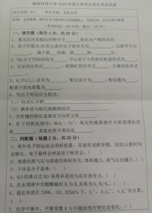 以上就是小編整理的“考研真題:湖南科技大學611-無機化學2020碩士招生考試自命題科目試題”的全部內容!更多真題資料請關注“考研專業課真題”欄目!祝考研成功!