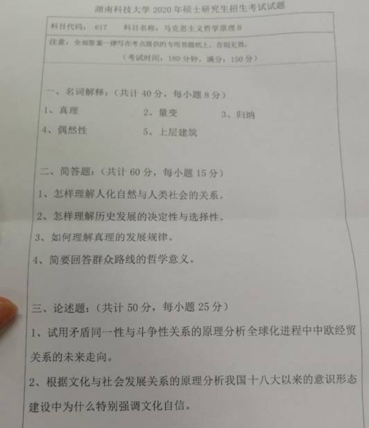 以上就是小編整理的“考研真題:湖南科技大學617-馬克思主義哲學原理2020碩士招生考試自命題科目試題”的全部內容!更多真題資料請關注“考研專業課真題”欄目!祝考研成功!