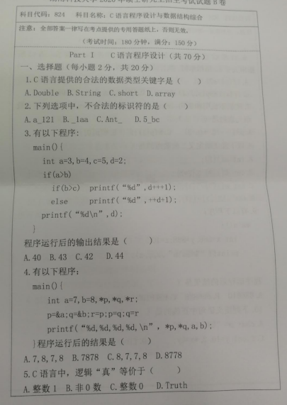 以上就是小編整理的“考研真題:湖南科技大學824-C語言程序設計與數據結構綜合2020碩士招生考試自命題科目試題”的全部內容!更多真題資料請關注“考研專業課真題”欄目!祝考研成功!