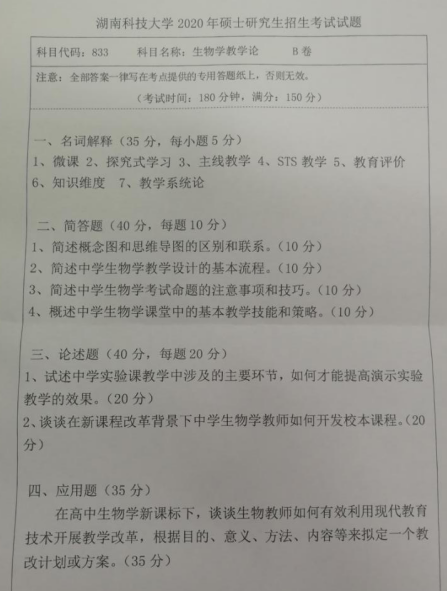以上就是小編整理的“考研真題:湖南科技大學833-生物學教學論2020碩士招生考試自命題科目試題”的全部內容!更多真題資料請關注“考研專業(yè)課真題”欄目!祝考研成功!