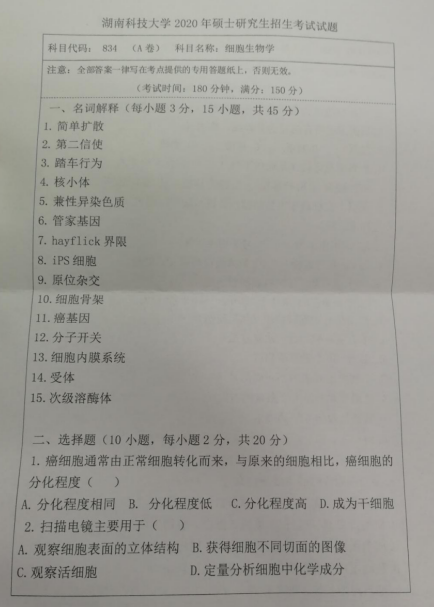 以上就是小編整理的“考研真題:湖南科技大學834-細胞生物學2020碩士招生考試自命題科目試題”的全部內容!更多真題資料請關注“考研專業課真題”欄目!??佳谐晒?!