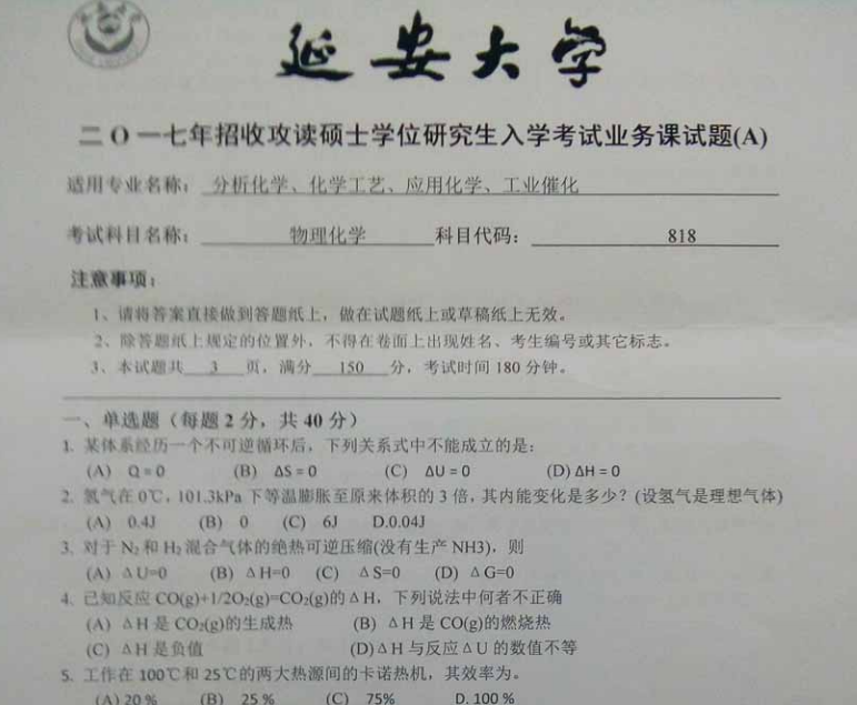 以上就是小編分享“考研真題:延安大學818物理化學2017年碩士研究生招生考試初試業務課試題”的全部內容內容,想了解更多考研相關信息,請持續關注研線網。