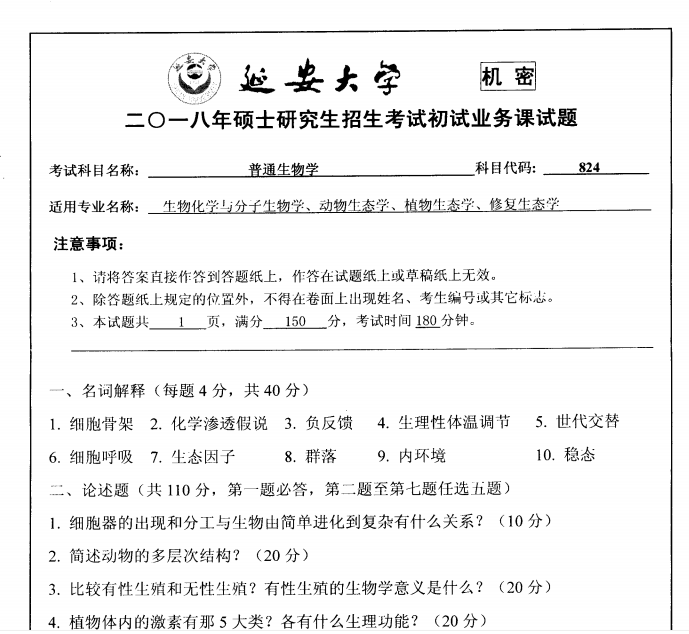 以上就是小編分享“考研真題:延安大學824普通生物學2018年碩士研究生招生考試初試業務課試題”的全部內容內容,想了解更多考研相關信息,請持續關注研線網。