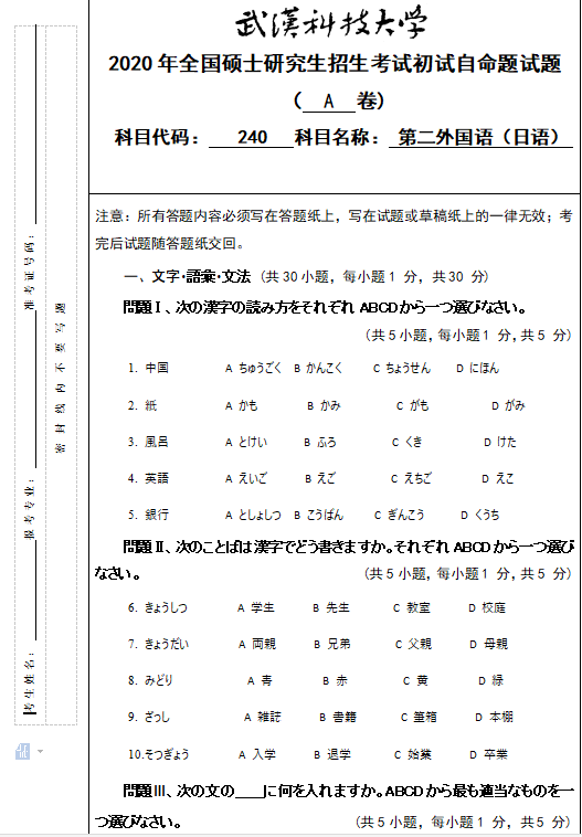 以上就是小編整理的“考研真題:武漢科技大學(xué)240第二外國(guó)語(yǔ)(日語(yǔ))2020年碩士研究生招生考試初試自命題試題”的全部?jī)?nèi)容!更多真題資料請(qǐng)關(guān)注“考研專業(yè)課真題”欄目!祝考研成功!