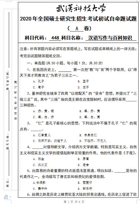 以上就是小編整理的“考研真題:武漢科技大學(xué)448漢語寫作與百科知識2020年碩士研究生招生考試初試自命題試題”的全部內(nèi)容!更多真題資料請關(guān)注“考研專業(yè)課真題”欄目!祝考研成功!