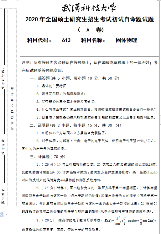 以上就是小編整理的“考研真題:武漢科技大學(xué)613固體物理2020年碩士研究生招生考試初試自命題試題”的全部內(nèi)容!更多真題資料請關(guān)注“考研專業(yè)課真題”欄目!祝考研成功!