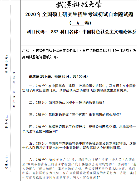 考研真題:武漢科技大學837中國特色社會主義理論體系2020年碩士研究生招生考試初試自命題試題
