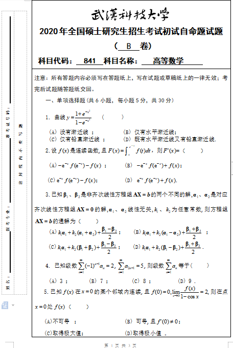 以上就是小編整理的“考研真題:武漢科技大學841高等數學2020年碩士研究生招生考試初試自命題試題”的全部內容!更多真題資料請關注“考研專業課真題”欄目!祝考研成功!
