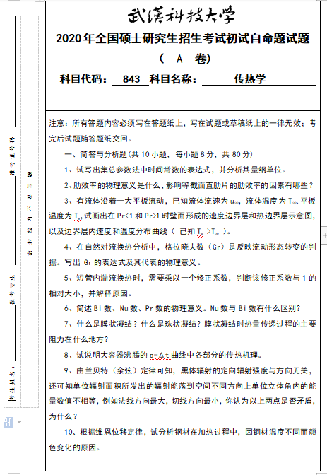 以上就是小編整理的“考研真題:武漢科技大學843傳熱學2020年碩士研究生招生考試初試自命題試題”的全部內容!更多真題資料請關注“考研專業課真題”欄目!祝考研成功!