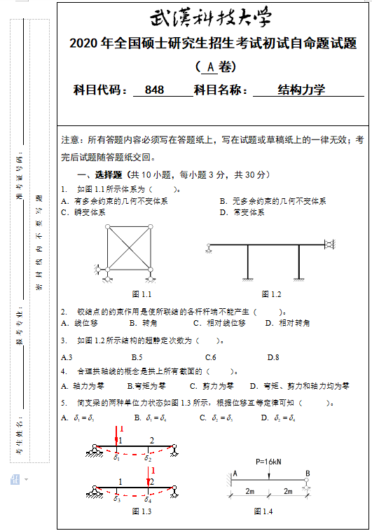 以上就是小編整理的“考研真題:武漢科技大學848結構力學2020年碩士研究生招生考試初試自命題試題”的全部內容!更多真題資料請關注“考研專業課真題”欄目!??佳谐晒?!