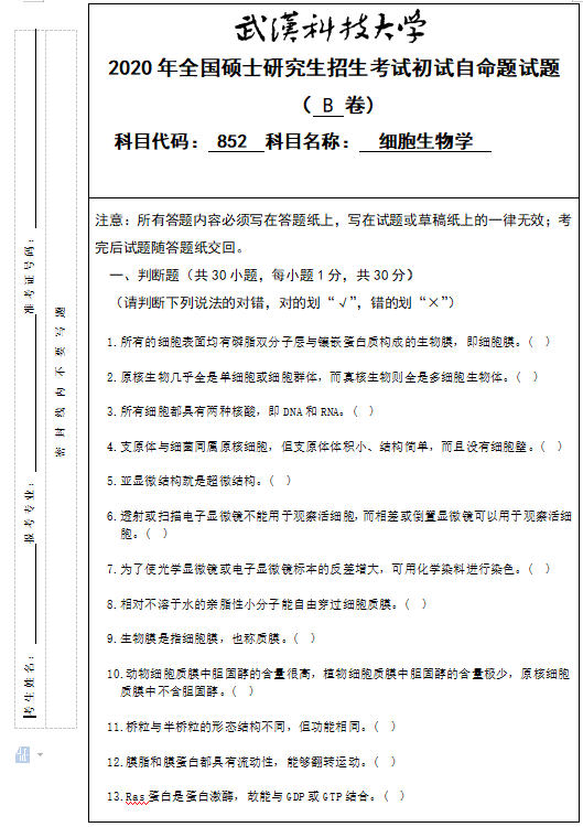 以上就是小編整理的“考研真題:武漢科技大學852細胞生物學2020年碩士研究生招生考試初試自命題試題”的全部內容!更多真題資料請關注“考研專業課真題”欄目!祝考研成功!
