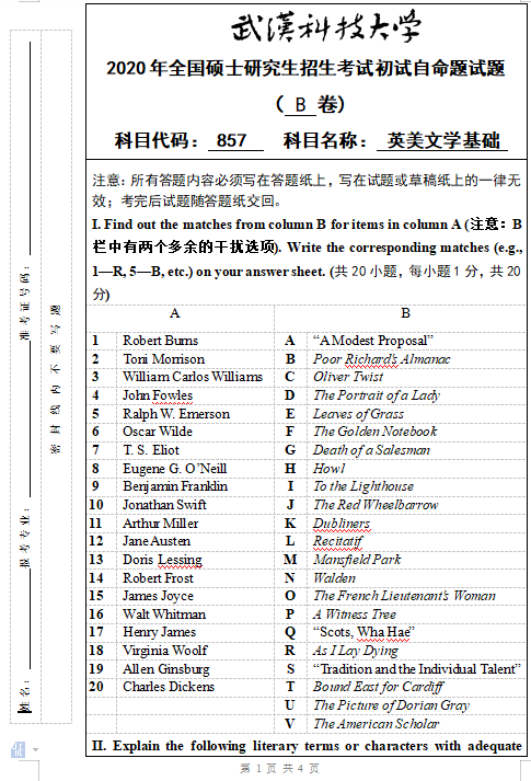 以上就是小編整理的“考研真題:武漢科技大學857英美文學基礎2020年碩士研究生招生考試初試自命題試題”的全部內容!更多真題資料請關注“考研專業課真題”欄目!祝考研成功!
