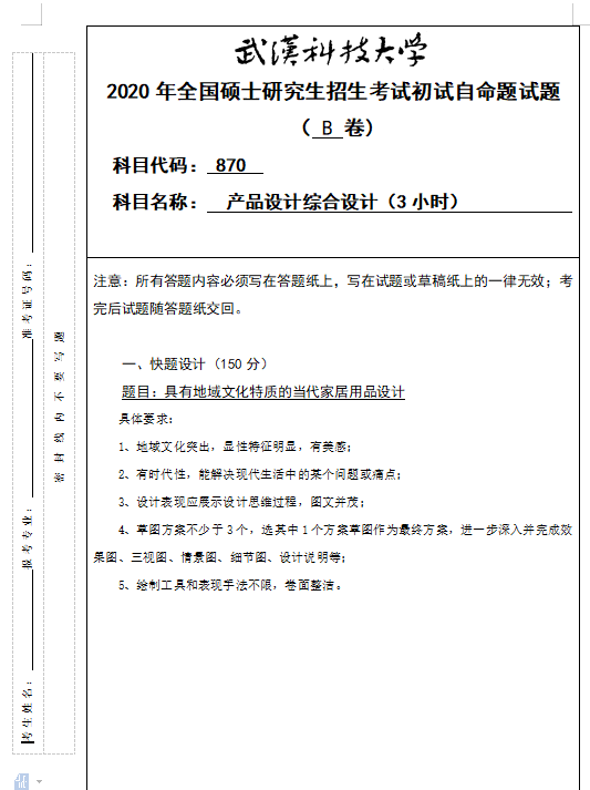考研真題:武漢科技大學870產品設計綜合設計(3小時)2020年碩士研究生招生考試初試自命題試題