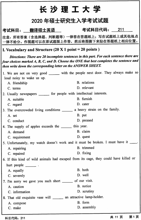 以上就是小編整理的“考研真題:長沙理工大學211翻譯碩士英語2020年碩士研究生招生考試初試試題”的全部內(nèi)容!更多真題資料請關注“考研專業(yè)課真題”欄目!??佳谐晒Γ?/div>