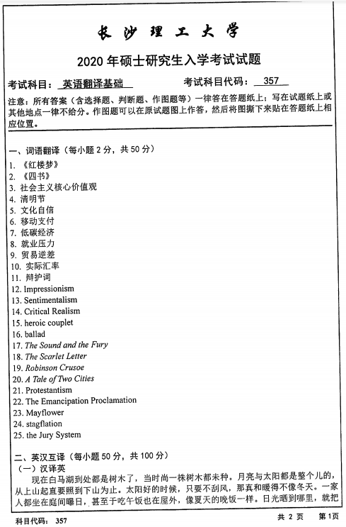以上就是小編整理的“考研真題:長沙理工大學357英語翻譯基礎2020年碩士研究生招生考試初試試題”的全部內容!更多真題資料請關注“考研專業課真題”欄目!祝考研成功!