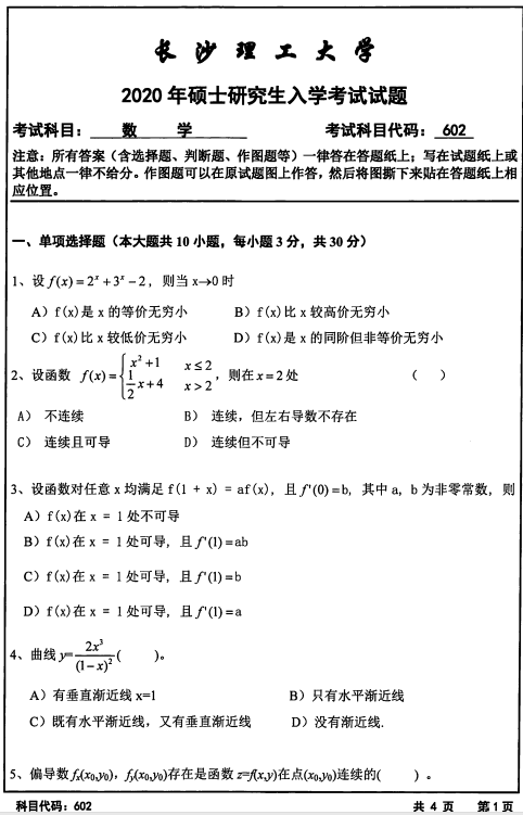 以上就是小編整理的“考研真題:長沙理工大學602數學2020年碩士研究生招生考試初試試題”的全部內容!更多真題資料請關注“考研專業課真題”欄目!祝考研成功!