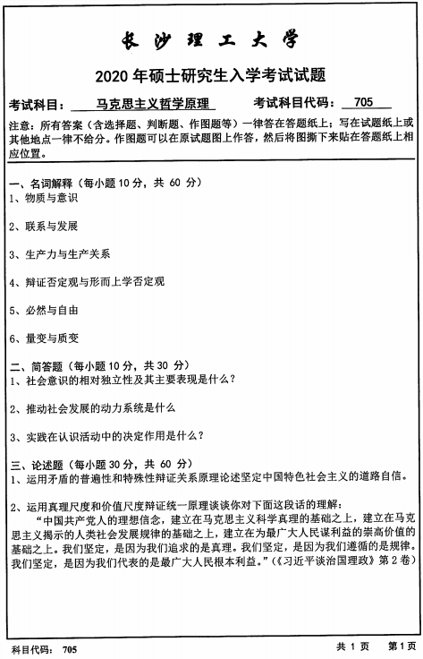 以上就是小編整理的“考研真題:長沙理工大學705馬克思主義哲學原理2020年碩士研究生招生考試初試試題”的全部內容!更多真題資料請關注“考研專業課真題”欄目!祝考研成功!