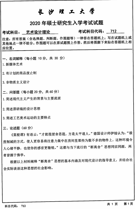 以上就是小編整理的“考研真題:長沙理工大學712藝術設計理論2020年碩士研究生招生考試初試試題”的全部內容!更多真題資料請關注“考研專業課真題”欄目!祝考研成功!