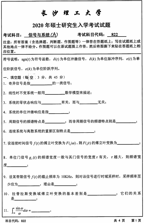 以上就是小編整理的“考研真題:長沙理工大學822信號與系統(A)2020年碩士研究生招生考試初試試題”的全部內容!更多真題資料請關注“考研專業課真題”欄目!祝考研成功!
