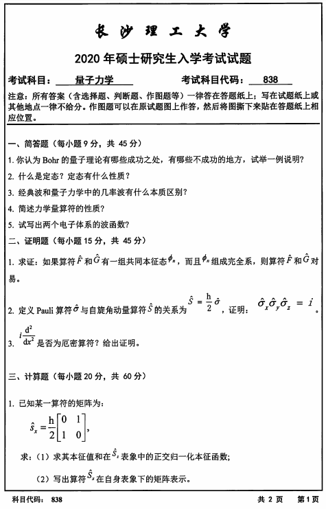 以上就是小編整理的“考研真題:長沙理工大學838量子力學2020年碩士研究生招生考試初試試題”的全部內容!更多真題資料請關注“考研專業課真題”欄目!祝考研成功!