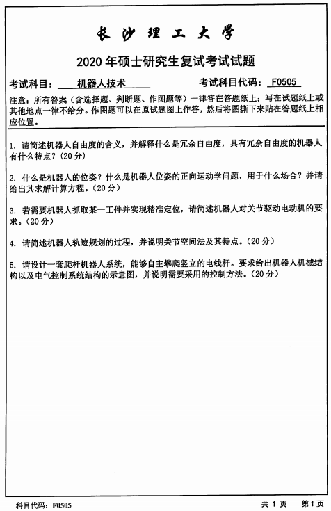 以上就是小編整理的“復試真題:長沙理工大學F0505機器人技術2020年碩士研究生招生考試復試試題”的全部內容!更多真題資料請關注“考研專業課真題”欄目!??佳谐晒?!