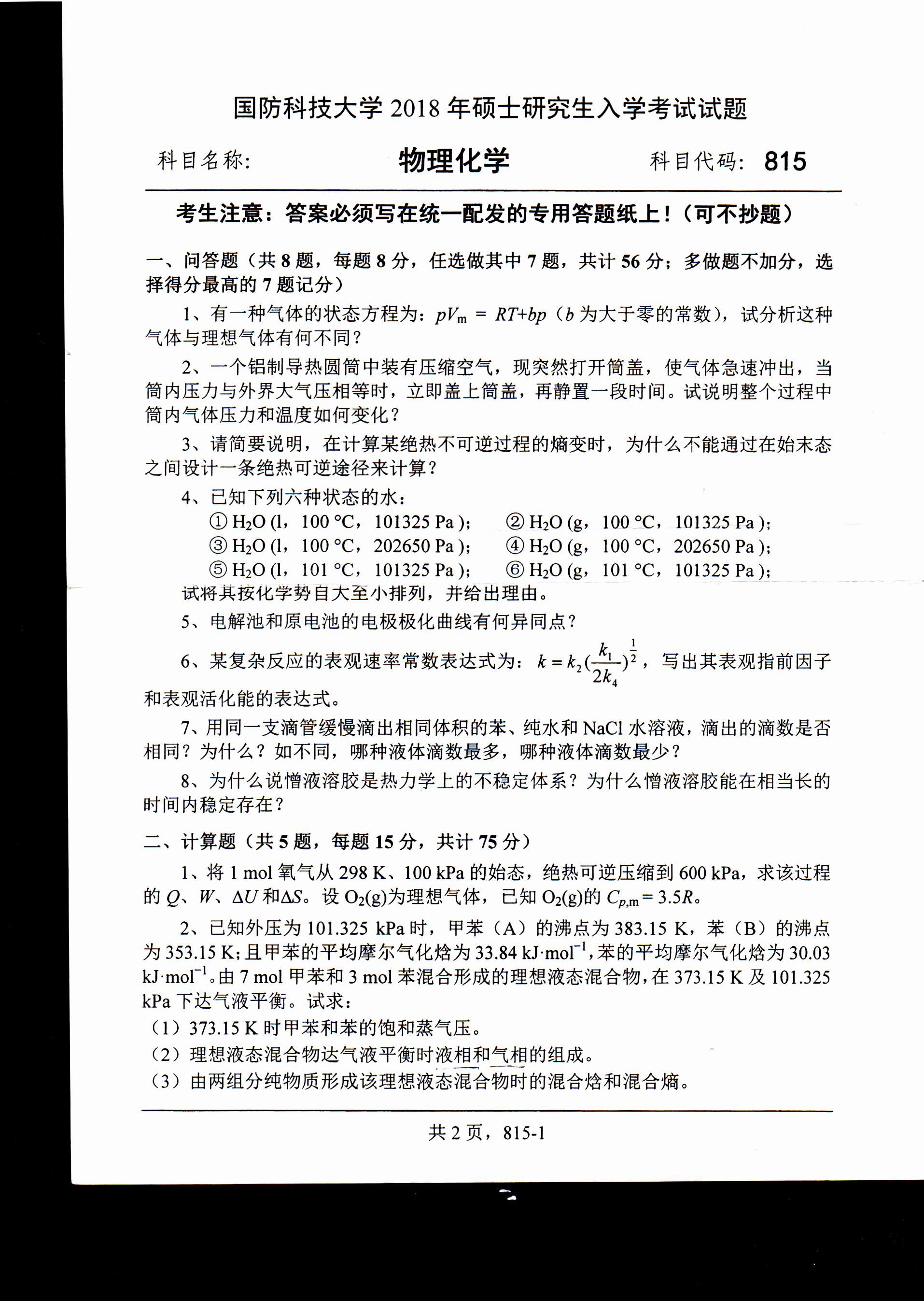 以上就是“考研真題:國防科技大學物理化學2018年碩士研究生專業(yè)課試題”的相關內(nèi)容,更多考研信息,請持續(xù)關注。