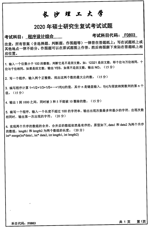 以上就是小編整理的“復試真題:長沙理工大學F0803程序設計綜合2020年碩士研究生招生考試復試試題”的全部內容!更多真題資料請關注“考研專業課真題”欄目!祝考研成功!