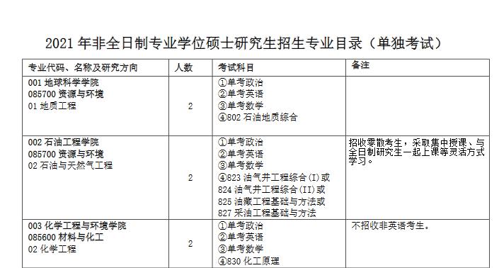2021考研專業目錄:中國石油大學(北京)2021年非全日制專業學位碩士研究生招生專業目錄(單獨考試)