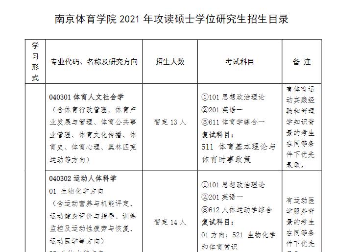 2021考研專業目錄:南京體育學院2021年攻讀碩士學位研究生招生目錄