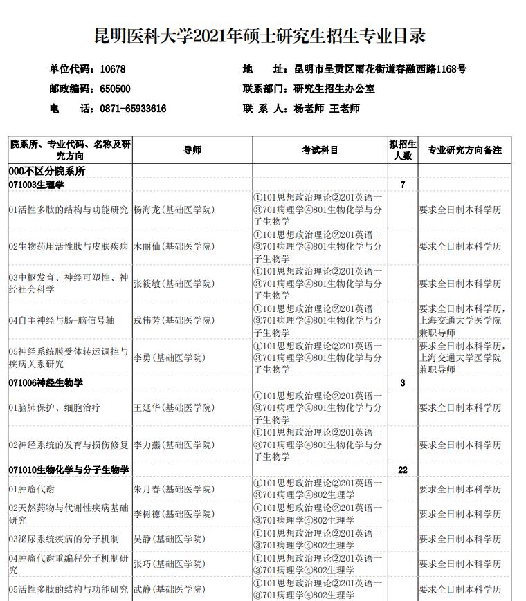 2021考研專業目錄:昆明醫科大學2021年碩士研究生招生專業目錄