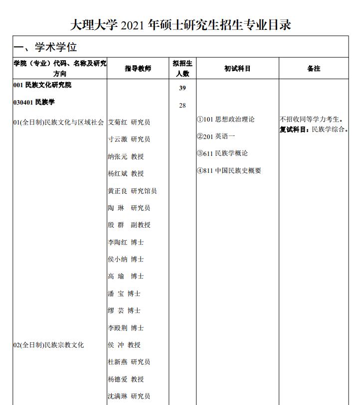 以上就是“2021考研專業目錄:大理大學2021年碩士研究生招生專業目錄”的相關內容!詳細請官網查詢,祝您考研成功!