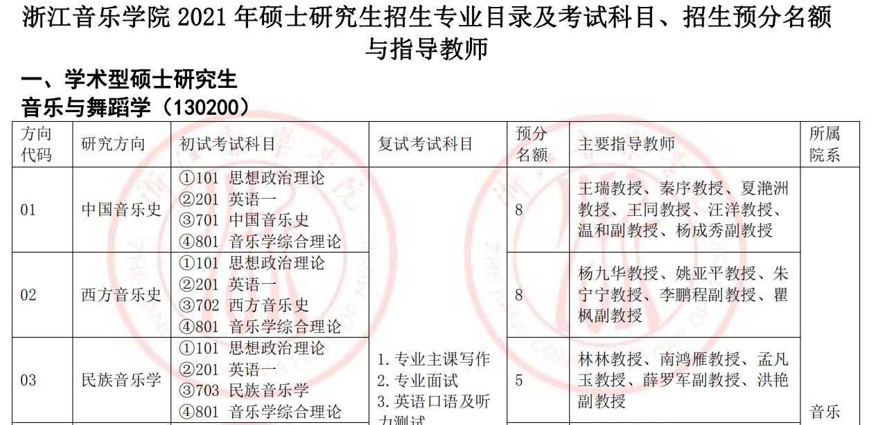 2021考研專業目錄:浙江音樂學院2021年碩士研究生招生專業目錄