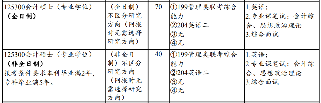 山東財經大學2019年全日制MPAcc擬招生70人,不區分研究方向。非全日制MPAcc擬招生40人,不區分研究方向。全日制MAud擬招生20人,不區分研究方向。如下圖: