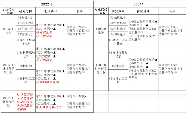 根據研究生培養需要,我院化學、材料科學與工程、資源與環境專業2022年碩士研究生招生初試科目及報考條件調整如下: