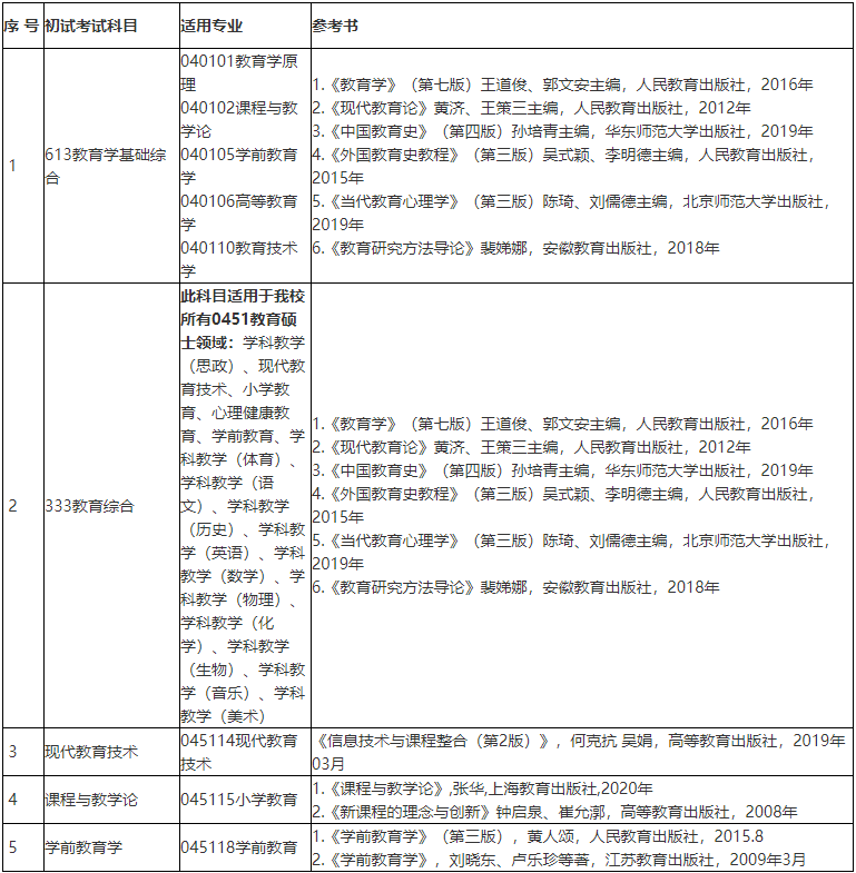 根據教育部要求及學校相關規定,教育學院2022年碩士研究生招生的初試科目及參考書做了較大調整,調整后的情況見下表,請相關考生提早做好準備。所列參考書目僅供參考,非考試指定用書,請各位考生按照考試大綱規定范圍充分備考。
