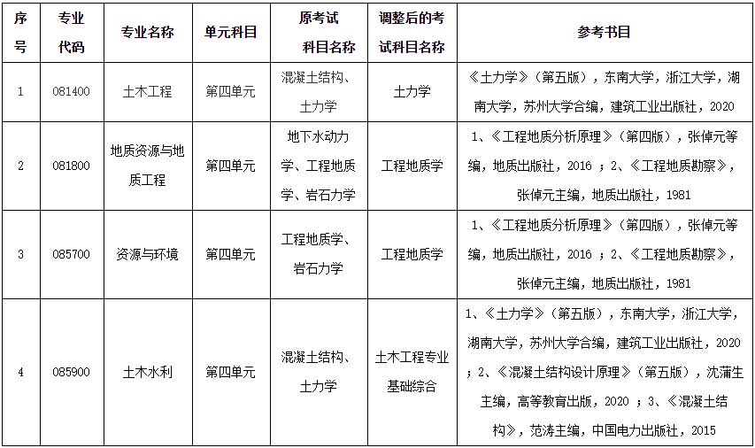 以上就是“2022考研科目調整:成都理工大學環境與土木工程學院入學考試部分科目調整”的全部內容!祝您考研成功!更多相關信息請持續關注本網站!