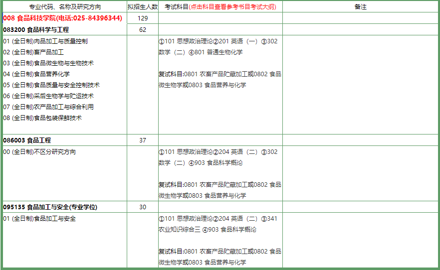 2022考研專業目錄:南京農業大學食品科技學院2022年碩士研究生招生專業目錄
